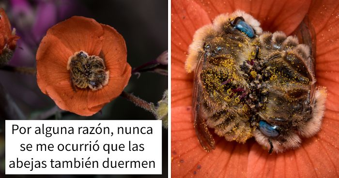 «No sabía que las abejas dormían en flores, pero esta especie (Diadasia diminuta) duerme en las flores llamadas Sphaeralceas. Sacan de ellas su polen favorito también.»
