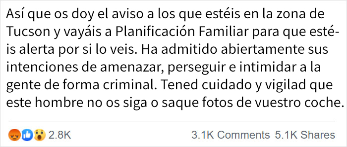 Esto recuerda a escenas de la «policía moral» que tienen grupos como los talibanes, pero este hombre de Tucson, Arizona, se ha tomado por su propia mano la tarea de «reeducar» a las mujeres que visitan el centro de Planificación Familiar. Este pro-vida vigilante ha sido identificado como Jordan Hart, y ha admitido abiertamente que hace fotos de las matrículas de los coches de las personas que entran en el edificio, para poder rastrearlas luego hasta su casa y llevarles «concienciación y verdad» sobre el aborto.