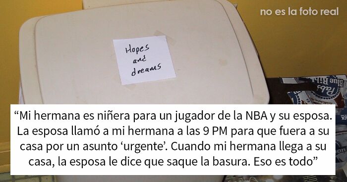 Mi hermana es niñera para un jugador de la NBA y su esposa. La esposa llamó a mi hermana a las 9 de la noche para que fuera a su casa por un asunto "urgente". Cuando mi hermana llega a su casa, la esposa le dice que saque la basura. Eso es todo. Mi hermana condujo una hora de ida y vuelta para sacar la basura.