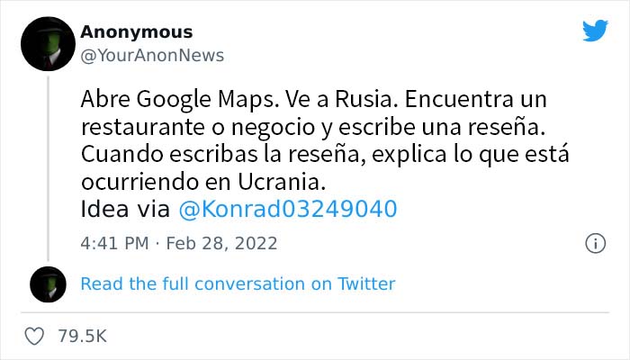 A alguien se le ocurrió la idea de escribir reseñas en Google para las empresas rusas diciendo lo podrido que está el régimen y lo innecesaria que es la guerra. Otros están configurando su ubicación de Tinder en grandes ciudades de Rusia y cuando consiguen un match, envían fotos desde Ucrania mostrando cómo el régimen de Putin está haciendo sufrir a otro país.