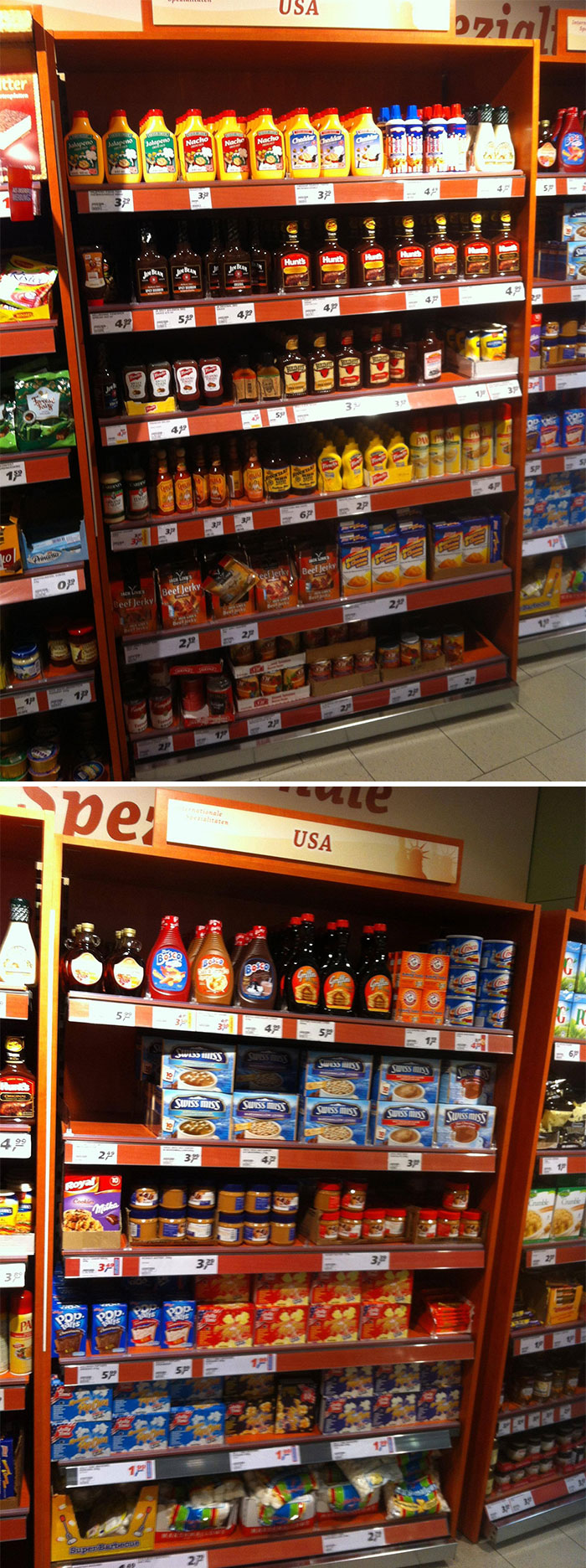 Siempre es interesante ver lo que otras personas piensan de los hábitos culinarios de tu país, y echar un ojo a la sección correspondiente en los supermercados de otros países es una buena forma de hacerlo. Esto es exactamente lo que pasó cuando skiptonskipper publicó una imagen del aspecto que tiene la sección de «comida estadounidense» en una tienda de Reino Unido, y después otras personas hicieron lo mismo en otros países.