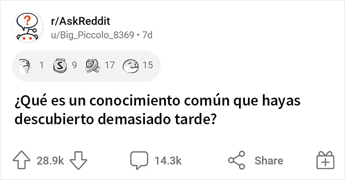 Para demostrarte que todos tenemos nuestros momentos, Bored Panda echa un vistazo a una discusión en Reddit, iniciada por el usuario Big_Piccolo_8369, en la que la gente ha ido revelando qué cosas descubrieron vergonzosamente tarde en la vida. Desde la conservación de las verduras hasta la toma de decisiones cuando estás cachondo, ¡sigue desplazándote y mira algunas de las entradas más populares!