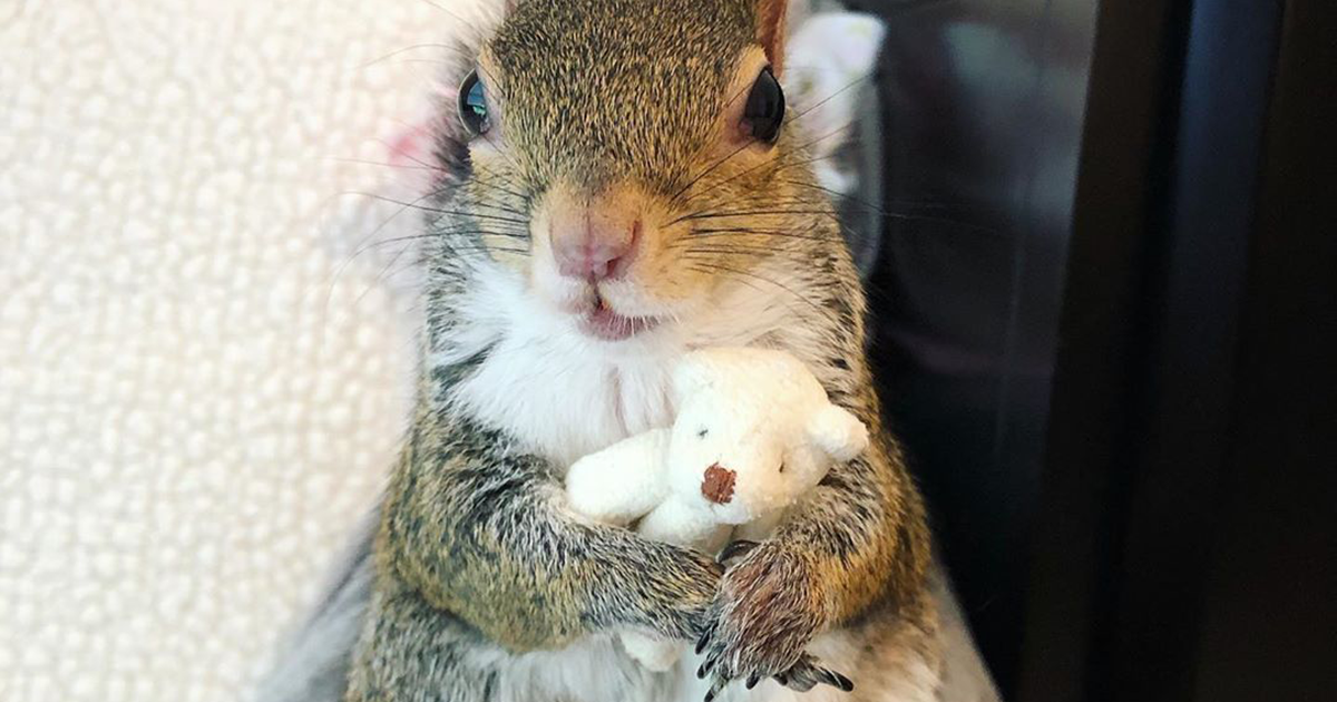 Esta ardilla rescatada del huracán Isaac no puede dormir sin su oso de peluche, y es lo más adorable