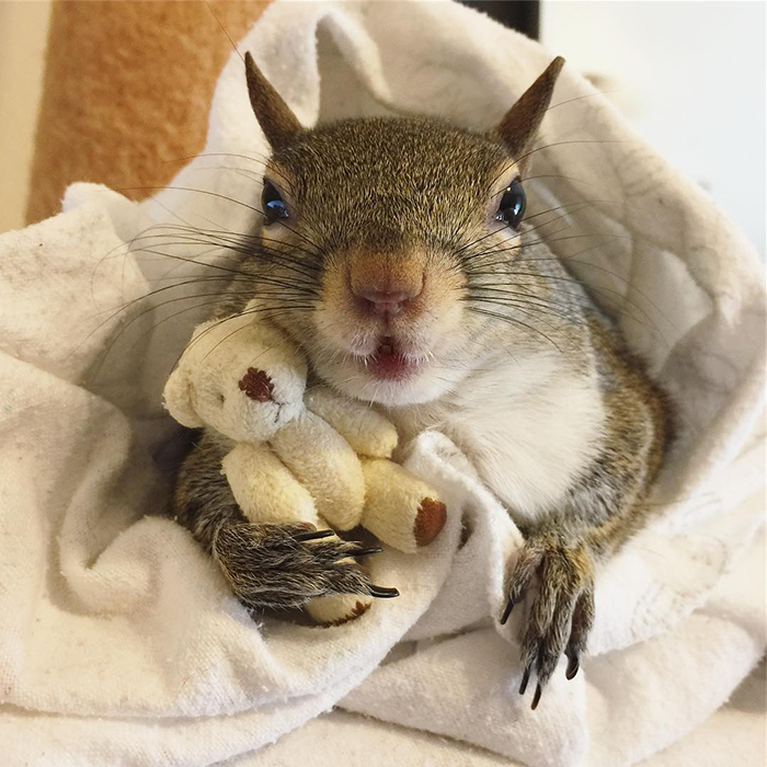 Esta ardilla rescatada del huracán Isaac no puede dormir sin su oso de peluche, y es lo más adorable