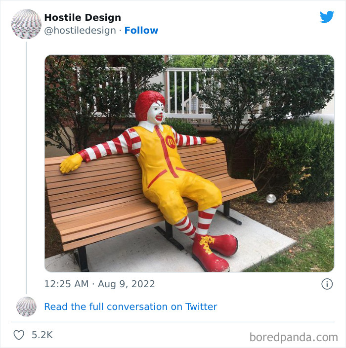 Si no sabes a qué nos referimos, echa un vistazo a la recopilación de imágenes que hemos recogido de la cuenta. Solo para advertirte, es una de esas cosas que una vez que te enteras, empiezas a ver en todas partes. Sigue leyendo para encontrar también una entrevista en profundidad con la fundadora de esta página. Vota positivamente los ejemplos que más te han sorprendido, y si alguna vez has detectado casos de diseño hostil en tu propia ciudad, no dejes de contárnoslo en los comentarios de abajo.