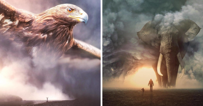 Recientemente, mis imágenes están llamando bastante la atención. Lo que aparece en mis manipulaciones fotográficas son sobre todo animales gigantes y humanos diminutos. La maravilla del mundo animal siempre ha sido mi inspiración, y me gusta creer que todos tenemos nuestro espíritu animal que nos desafía, guía y protege en este mundo tan caótico.