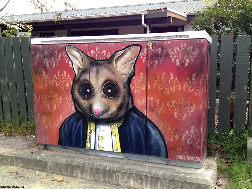En los últimos 2 años he decorado con mis obras 15 de estas cajas con cuadros de alumbrado por todo Auckland, Nueva Zelanda. Ocurrió así: en 2013 me había tomado unas cuantas cervezas y pinté un Grumpy Cat en la pared del parque para perros. Lo borraron, los vecinos se enfadaron e hicieron una petición al ayuntamiento. Mi amigo metió un artículo sobre esto en un periódico local, y un trabajador de Chorus (la compañía dueña de estas cajas) lo leyó y me preguntó si en vez de paredes me gustaría pintar sus cuadros de acometidas.