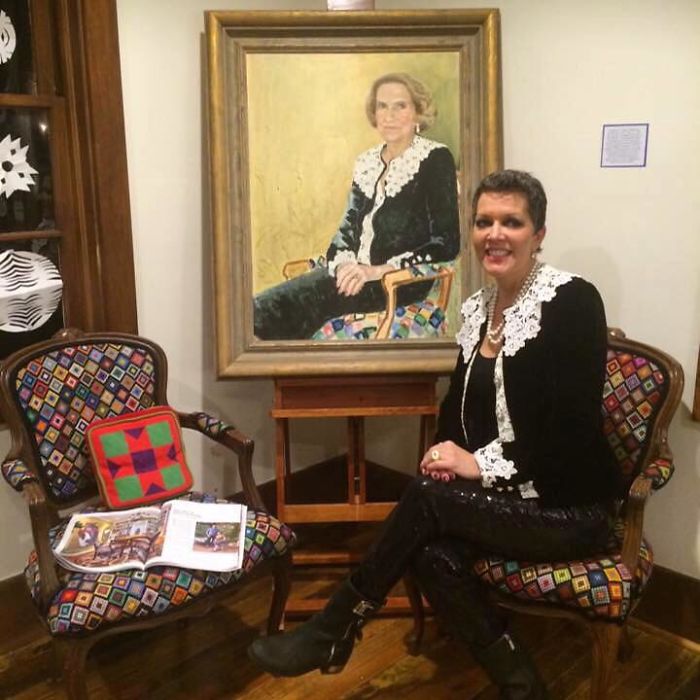 Retrato de mi abuela sentada en una silla que bordó. Yo estoy sentada en la silla que ella me ayudó a bordar, con su mismo traje. Lo heredé todo
