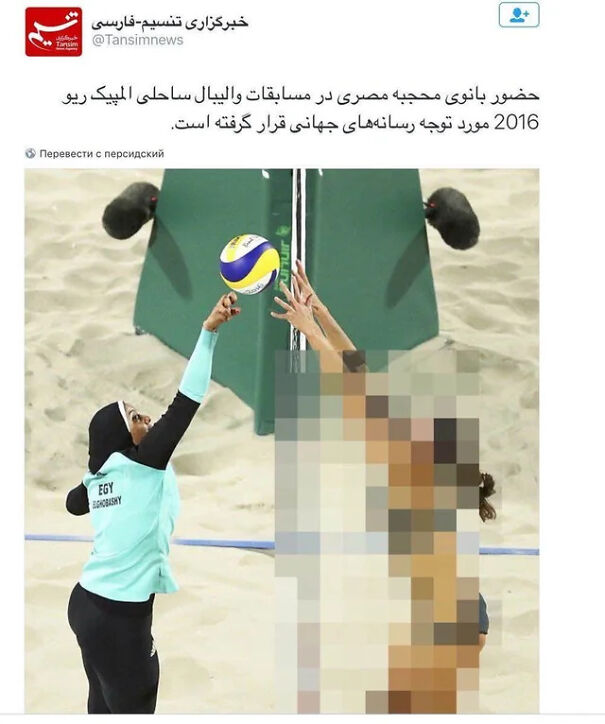 Jugador de voleibol de playa con velo en acción, mientras la censura difumina la imagen del oponente en la red.