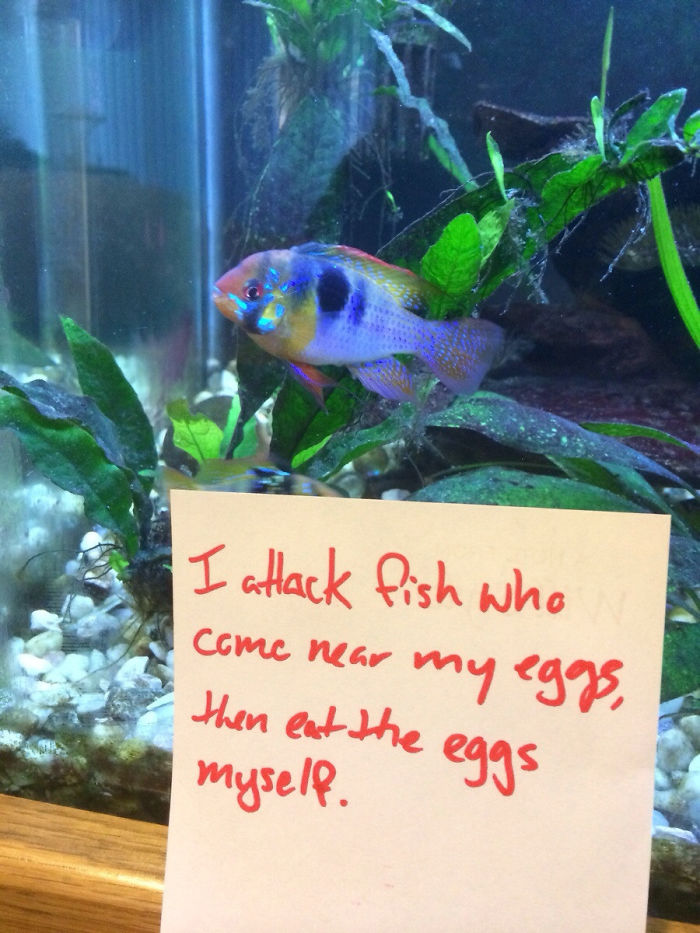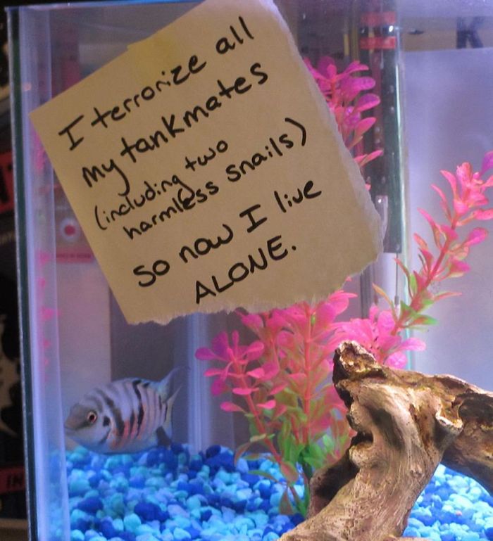 Seguramente la mayoría de nosotros adoramos a nuestras mascotas, sin importar lo que sean: gatos, perros o... ¿peces? Pues sí. Aunque gatos y perros se llevan toda la atención de internet, los dueños de peces han decidido no ser menos. Con eso en mente, alguien pensó que la mejor forma de llamar la atención son unas buenas publicaciones de petshaming. ¿Os acordáis? Nos reímos mucho con estas listas donde se avergonzaba a perros y gatos por su mal comportamiento, así que vamos a reírnos también con estos peces malos y traviesos. Aquí debajo puedes ver a estos criminales acuáticos.