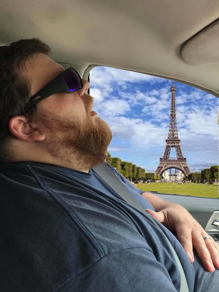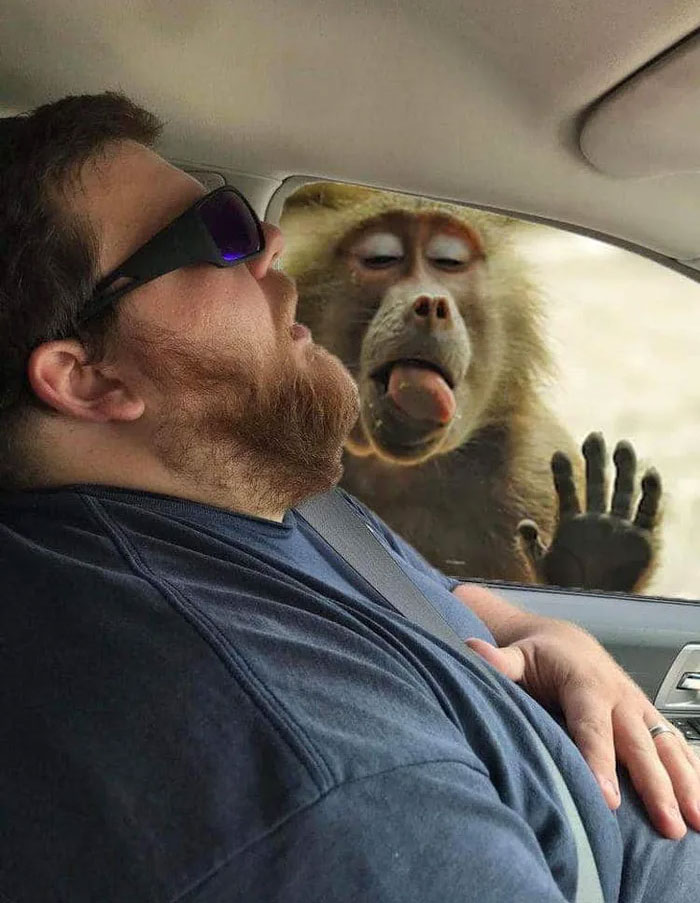 Pero siempre está el otro lado de la moneda, y es las muchas cosas emocionantes que te puedes perder. Esta mujer, Sharea Overman, disfruta mucho de eso, y decidió enseñar una lección a su marido durmiente. Le hizo una foto cuando simulaba estar dormido en el coche y la publicó en un grupo de Facebook. Su petición fue muy sencilla: photoshopear cosas en la ventanilla del coche para mostrarle a su marido lo que se perdió mientras dormía.