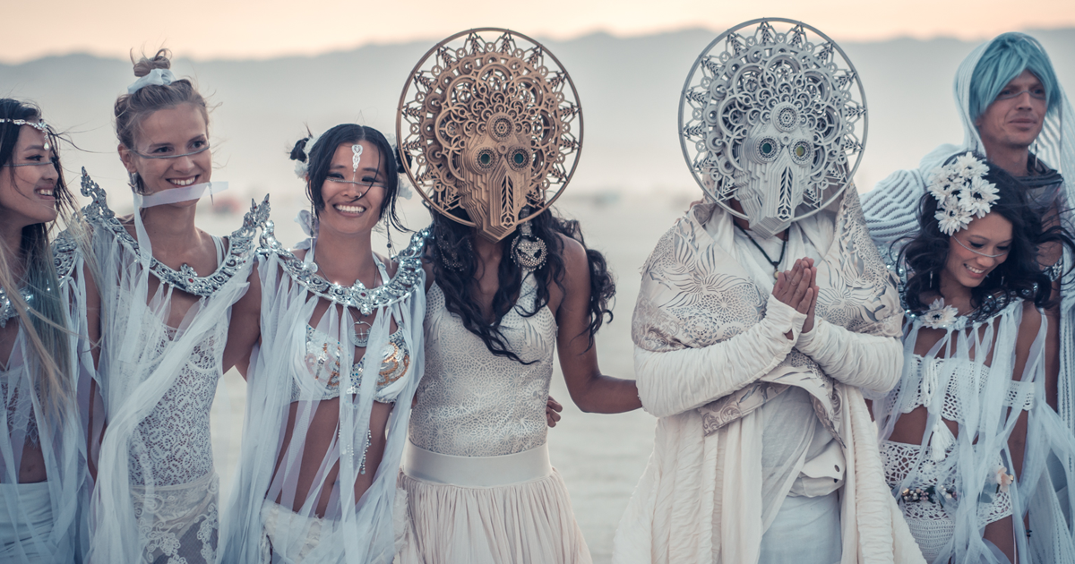Con el espíritu típico de Burning Man, decidimos intercambiar servicios: yo haría los diseños del vestuario de Gilles para Burning Man y él tomaría fotos de mi línea de ropa, Fringe & Epaulette. Ese fue el comienzo de nuestra unión creativa y, desde entonces, hemos colaborado en incontables proyectos artísticos, que incluyen el diseño de las prendas para nuestra boda.