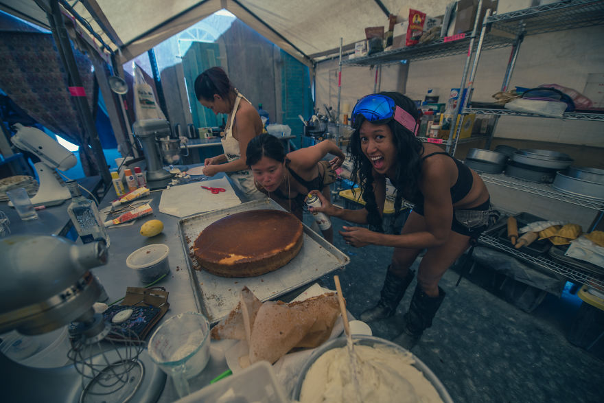 Trabajar en la pastelería fue uno de los mejores momentos de mi vida. Lo extraño de hornear un pastel gigante en medio del desierto fue increíble, y fue bastante relajante mezclar todos los ingredientes y decorar la torta. Respeto mucho a los voluntarios de la pastelería de Black Rock City, que trabajan todo el día para hornear deliciosos pasteles franceses para los ciudadanos del lugar.