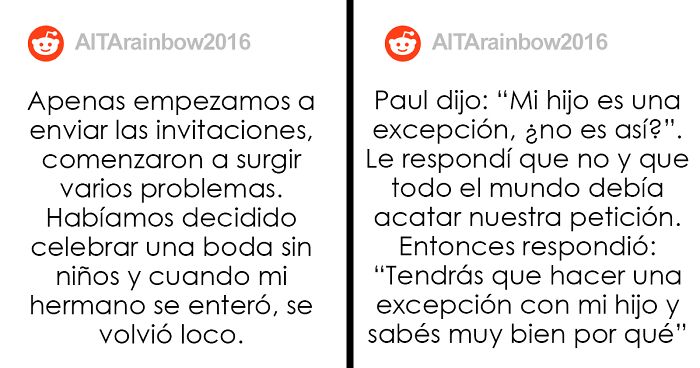 Esta futura novia de 33 años quien está por casarse en octubre con Derek, el amor de su vida, decidió ingresar a Reddit para pedir opiniones sobre la forma en la que manejó esta situación tan compleja que involucra a su hermano y su sobrino, el cual es un “bebé milagro”. La mujer planeaba celebrar una boda sin niños, no obstante, su familia “enloqueció” al enterarse de que no había hecho una excepción con su sobrino, el hijo de su hermano, de 4 años.
