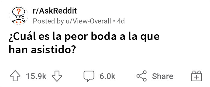 Interesado en las peores de todas, un usuario de Reddit u/View-Overall hizo una publicación preguntando: “¿Cuál es la boda más vergonzosa a la que han asistido?” y llegaron las respuestas. Hasta el momento, hay más de 6,000 comentarios debajo de esa pregunta, muchos de los cuales cuentan un desastre tras otro.