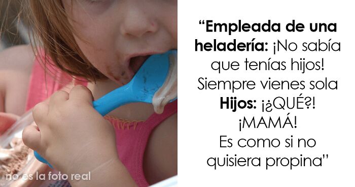 Empleada de una heladería: ¡No sabía que tenías hijos! Siempre vienes sola. Hijos: ¡¿QUÉ?! ¡MAMÁ! Es como si no quisiera propina.