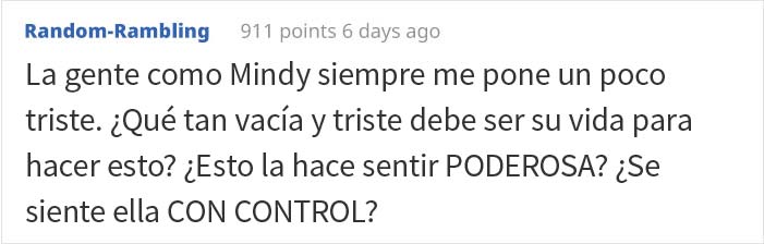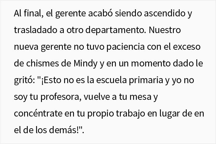 A juzgar por las secuelas de la prueba, u/kathjoy no cree que Mindy haya cambiado. «Ella seguía tomando sus notas. Creo que estaba esperando a que uno de nosotros hiciera algo importante para poder reportarnos, y seguía intentando denunciarlos por acoso escolar cuando no nos plegamos a su voluntad», explican. «Nunca llegó muy lejos. Cuando nuestro nuevo director se negó a ocuparse de sus quejas, Mindy dedicó su energía a su otra «afición» en el trabajo: los chismes. Era una chismosa muy conocida y empezó a difundir rumores sobre mí, mis colegas y nuestro nuevo director. Sus rumores sobre mí eran especialmente rencorosos, así que creo que estaba realmente enfadada conmigo. Seguía trabajando allí cuando me fui. No tengo ni idea de si sigue allí ahora».