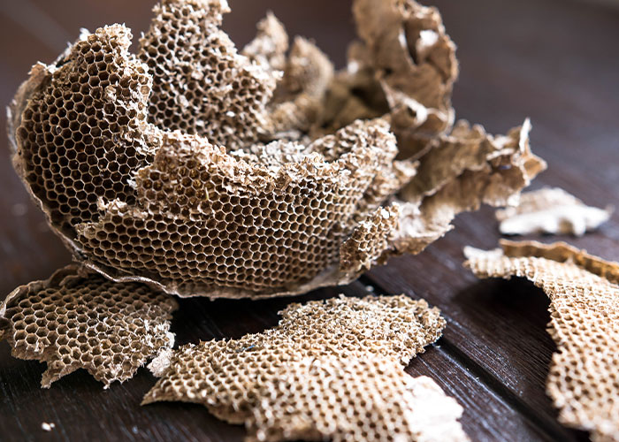 He comprado una casa muy antigua. El anterior propietario nació y murió en la casa a los 97 años. Tenía mala salud y estaba bastante senil antes de morir, así que la casa estaba en mal estado y muy sucia. Un día estaba limpiando la estantería en el pequeño, extraño y mal iluminado sótano. Estaba en un rincón oscuro mirando algunas cosas y tratando de decidir qué hacer con ellas cuando miré hacia arriba y vi una cosa curvada de color marrón que colgaba de las vigas. Era de unos 1,2m por 1,2m y unos 30cm de espesor o más. Mi primer pensamiento fue que era una vaina como en "La invasión de los ladrones de cuerpos". Cogí una linterna y miré de cerca y me di cuenta de que era mucho peor. . . era el mayor nido de avispas que había visto nunca. Salí corriendo y traté de averiguar qué hacer. Después de pensarlo un poco me di cuenta de que no había visto avispas en el sótano o en la casa, así que lo más probable es que estuviera vacío. Así que lo saqué con cautela y cuidado, con la menor destrucción posible. El exterior era una hermosa y frágil estructura de papel con una pátina de mármol. Pude salvar una pieza de unos 12 x 18 x 10. Todavía la tengo colgada en mi estudio.