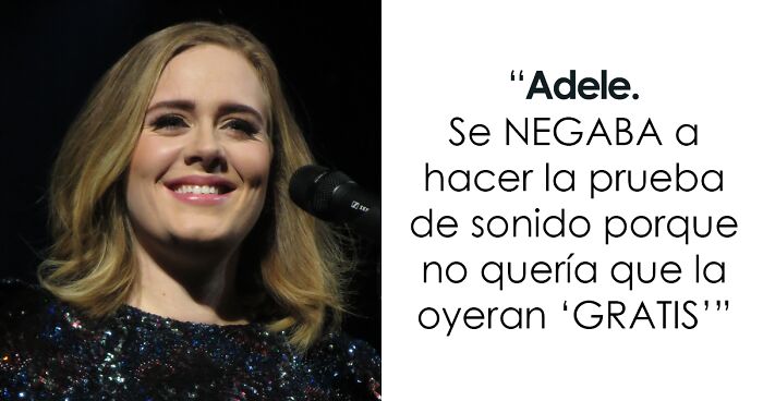 Una amiga de mi mamá trabajaba en seguridad en conciertos, siempre nos contaba lo amables que eran las bandas, PERO Adele era una pesadilla, sus fans comenzaron a hacer fila antes de su concierto afuera del estadio y Adele SE NEGÓ a hacer la prueba de sonido porque no quería que cualquiera pudiera escucharla “GRATIS” y no podías mirarla cuando te hablaba.