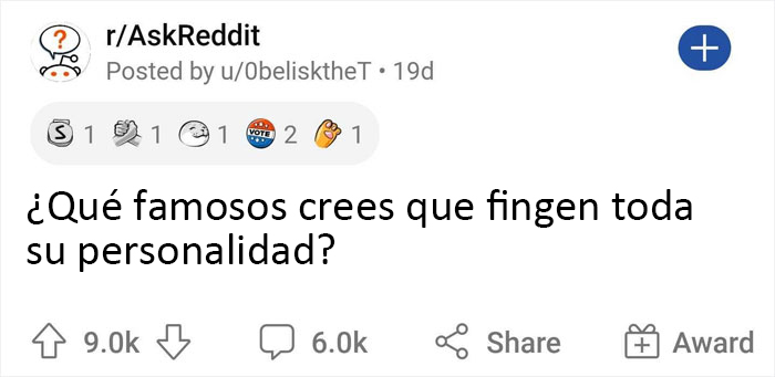 El autor del hilo, el redditor u/0belisktheT, provocó un debate tras pedir a la gente su opinión sobre qué famosos podrían estar "fingiendo toda su personalidad". Hemos recopilado algunas de las respuestas más interesantes, Panda, así que desplázate hacia abajo y lee algunos de sus pensamientos y sospechas.
