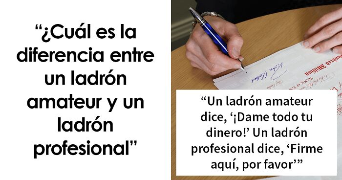 “¿Cuál es la diferencia entre un ladrón amateur y un ladrón profesional? Un ladrón amateur dice, "¡Dame todo tu dinero!" Un ladrón profesional dice, "Firme aquí, por favor".