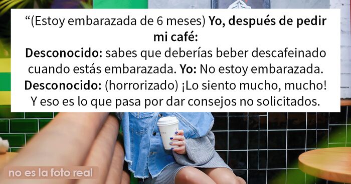 (Estoy embarazada de 6 meses) Yo, después de pedir mi café: Desconocido en Starbucks: sabes que deberías beber descafeinado cuando estás embarazada. Yo: Yo... no estoy embarazada. Desconocido: (horrorizado) ¡Lo siento mucho, mucho! Y eso es lo que pasa por dar consejos no solicitados.