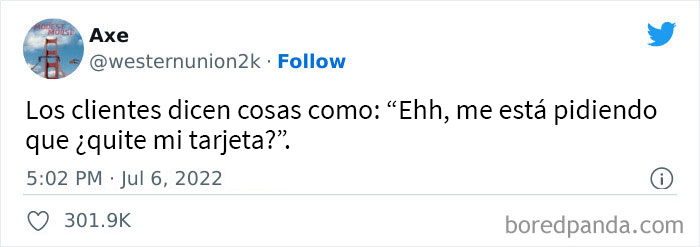 La semana pasada, Westernunion2k tuiteó: “Los clientes dicen [cosas] como: ‘Ehh, me está pidiendo que ¿quite mi tarjeta?’”, lo cual suscitó una conversación en la que muchos otros empleados compartieron momentos de sus trabajos, donde los clientes los hicieron sentirse exasperados. A continuación, leerán algunas de estas respuestas, y luego podrán dejarnos saber en los comentarios las cosas más estúpidas que le han oído decir a un cliente. Además, si les interesa leer un artículo de Bored Panda similar a este, contamos con uno perfecto justo aquí.