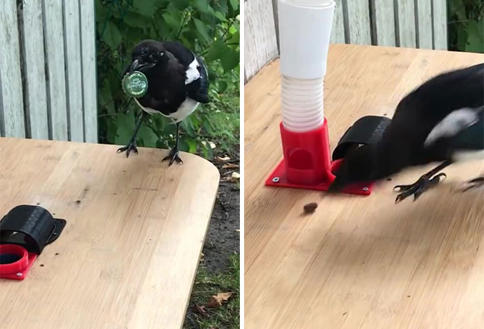 Así que decidió construir una máquina, y con su ayuda, entrenar a las urracas para recoger basura de los alrededores a cambio de comida. Esto no fue solo un proyecto nuevo para él, sino que parece que nadie había intentado hacer esto antes, ya que no encontró nada al respecto en internet, así que se apañó él solo.