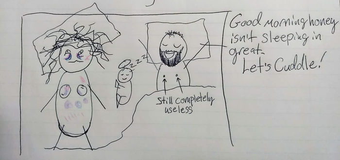 «Mi marido es fantástico, pero a veces, si no has vivido algo, no lo entiendes,» dijo Mattea a Buzzfeed. «Le he hecho dibujos antes, pero estos en particular vienen de mi falta de sueño y mis ganas de mostrar mi perspectiva.»
