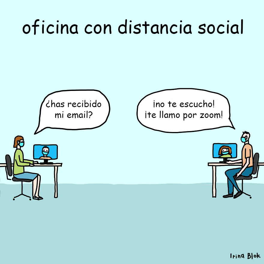 Me inspiro literalmente en cualquier cosa: un rollo de papel higiénico, hablar con amigos y familiares, comprar en línea, desplazarme por Facebook o leer las noticias. Originalmente fueron cómics de "antes y después" centrados en cómo nuestras vidas han cambiado durante la pandemia, pero desde entonces, he explorado algunos conceptos adicionales. Un tema nuevo que me ha entusiasmado son los objetos inanimados que pueden comunicarse entre sí, por ejemplo, ¿qué pasaría si una mascarilla pudiera quejarse de su trabajo con un rollo de papel higiénico? ¿O qué le diría una silla a un trasero? Descubrí que estos objetos son metáforas perfectas para la vida diaria (o tal vez me estoy volviendo loca por estar encerrada durante demasiado tiempo). También me gusta dibujar gráficos y juegos de palabras tontos.
