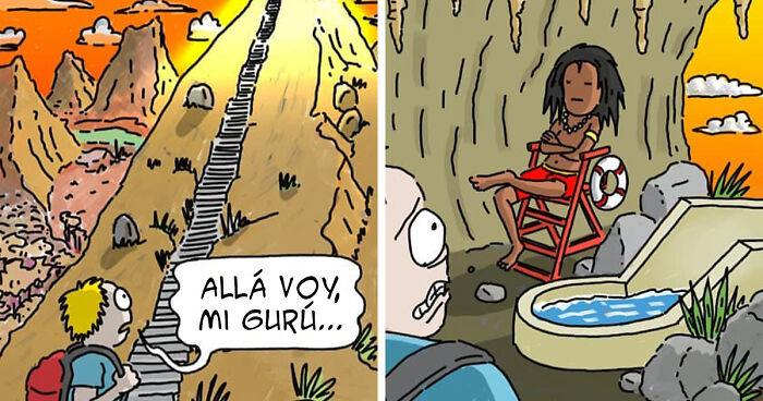 Dave le contó más a Bored Panda sobre sus antecedentes y sus influencias: "He vivido en varios países del mundo y tuve una infancia fantástica. Solía atrapar serpientes y pillar tablas de surf. Cuando era niño, me encantaba dibujar, pero lo dejé de adolescente. Más tarde me interesé por el cine. Fui a la escuela de cine y luego trabajé en la producción de videos durante varios años, lo cual odié. Pero tuve la oportunidad de viajar por China filmando un programa de cocina , lo cual fue genial. Una cosa que realmente noto ahora, al dibujar cómics, es que pienso en "tomas de cámara" para los paneles, como si el cómic fuera un cortometraje. Siento que tener experiencia en películas / videos es una gran ayuda. El lenguaje cinematográfico se traduce muy bien en los cómics".