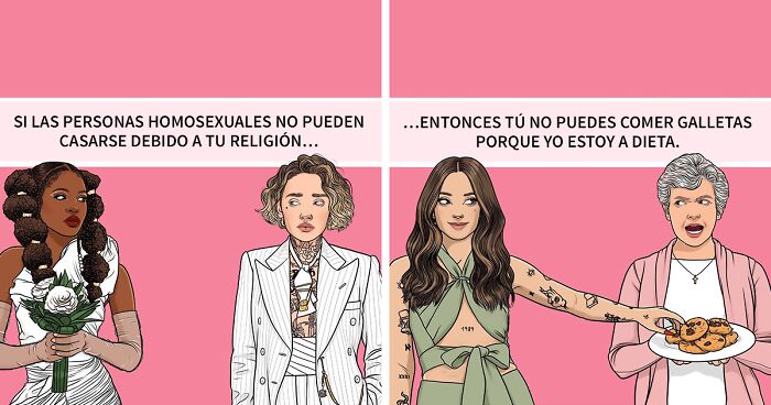Le preguntamos a Lainey si le resulta difícil transmitir un mensaje a través de una ilustración o cómic. “Mi mantra es siempre ‘simplificar, simplificar, simplificar’ para transmitir un mensaje”, explicó la artista, “pero también vengo del mundo de la moda y disfruto enormemente de dibujar atuendos elaborados y muchos detalles, por lo que mi mayor desafío suele ser encontrar un punto medio. Siempre me emociona cuando alguien en los comentarios señala un pequeño detalle o huevo de pascua que encontraron en la ilustración, ¡así que el trabajo extra vale la pena!