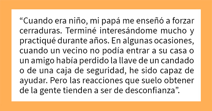 Cuando era niño, mi papá me enseñó a forzar cerraduras. Terminé interesándome mucho por los diferentes tipos de cerraduras y compré un juego para abrirlas. Practiqué durante años y me volví muy bueno con ciertos tipos de cerraduras. Así, con el correr de los años, en algunas ocasiones, cuando un vecino no podía entrar a su casa o un amigo había perdido la llave de un candado o de una caja de seguridad, he sido capaz de ayudar. Pero las reacciones que suelo obtener de la gente, incluso cuando los ayudo con la cerradura, tienden a ser de desconfianza. No soy un ladrón. Solo me gustan las cerraduras.