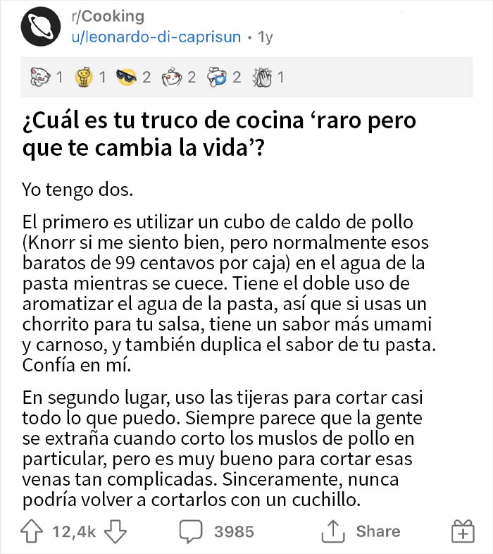 Así que si te apetece probar algunos trucos de cocina fuera de lo común, este esclarecedor hilo del subreddit Cooking es un lugar por el que empezar. "¿Cuál es tu truco de cocina 'raro pero que te cambia la vida'?", preguntó alguien y las respuestas se sucedieron, así que saca tus notas y veamos qué está cocinando.