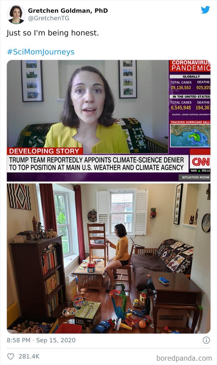 En este punto, todos sabemos bien que no todo es lo que parece cuando te conectas desde el comfort de tu hogar. Así que cuando la científica Gretchen Goldman compartió una reveladora foto mostrando lo que hay alrededor de ella cuando usa Zoom, se volvió viral. "Solo estoy siendo honesta," decía en el tuit, y este consiguió 282500 likes y 30600 retuits.
