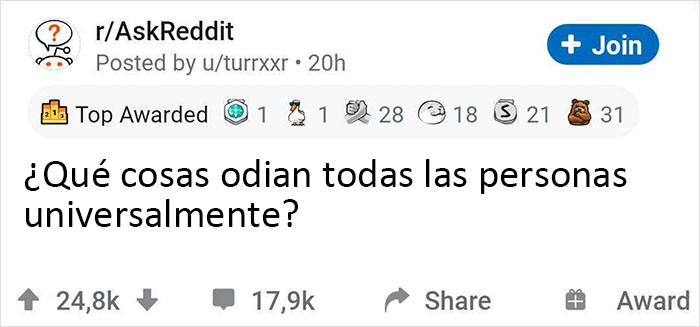 Hace unos días, el redditor u/turrxxr decidió averiguar qué es lo que nos ayuda a relacionarnos entre nosotros y formuló la siguiente pregunta: "¿Qué cosas odian todas las personas universalmente?" Y todo el mundo empezó a enviar inmediatamente sus respuestas. Desde el tráfico hasta los calcetines mojados, ¡aquí están las que han obtenido más upvotes!