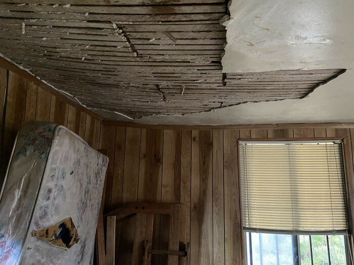 Los viejos techos de listones y yeso se están hundiendo, parece que está a punto de colapsar.