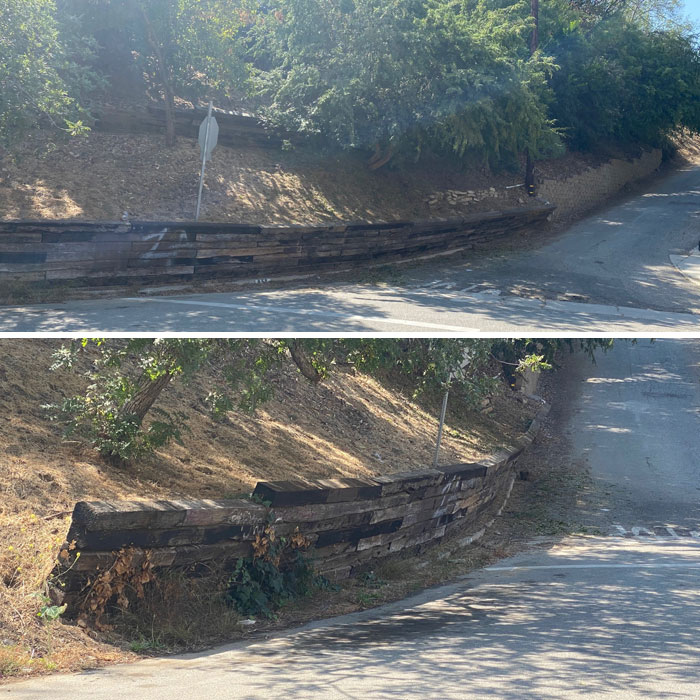 Otro "muro de contención" defectuoso que debería ser reemplazado pronto. Se puede ver hasta qué punto ha comenzado a inclinarse hacia la calle.