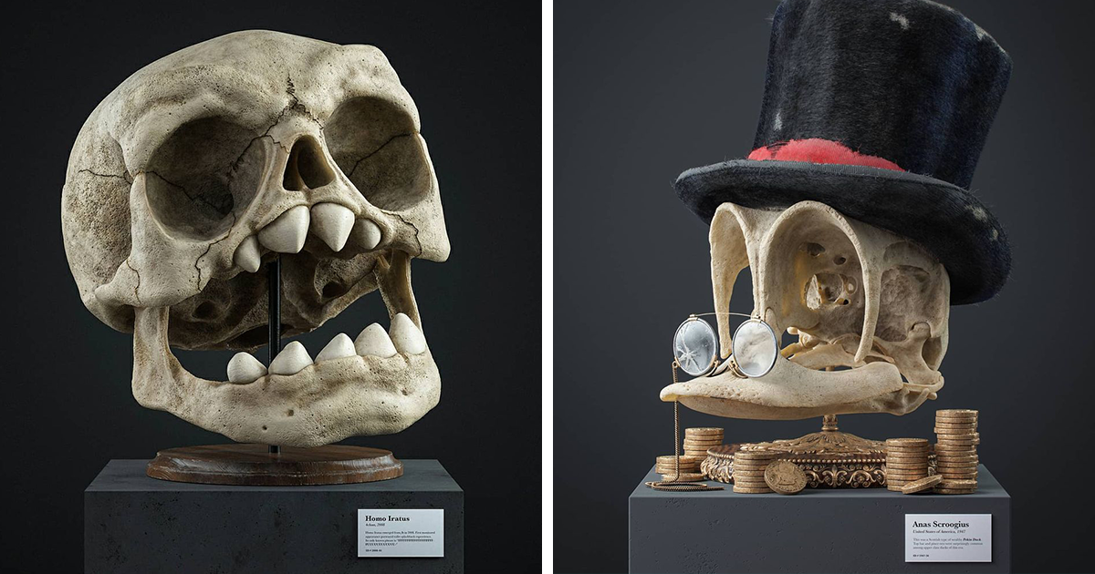 El artista Filip Hodas ha tenido en cuenta esta idea e hizo algunas ilustraciones realistas que muestran cómo serían los cráneos anatómicamente correctos de personajes populares. Manteniendo los atributos icónicos como sombreros o anteojos y agregando los “nombres científicos” de los personajes, Filip nos da la bienvenida a un museo virtual.