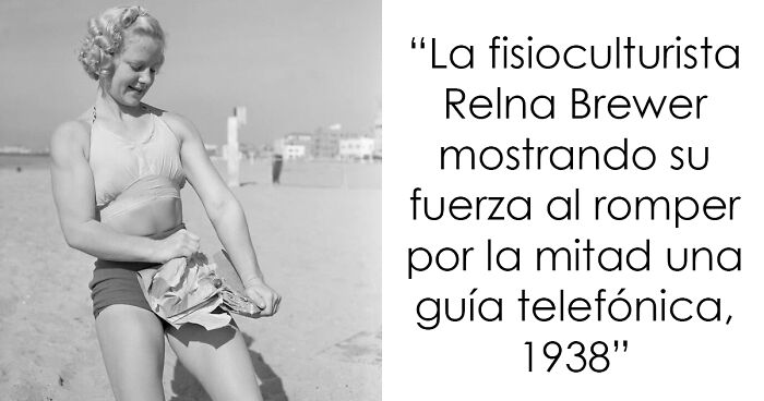 La fisioculturista Relna Brewer mostrando su fuerza al partir por la mitad una guía telefónica, 1938