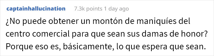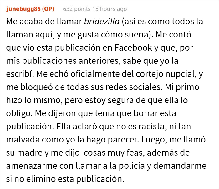 Hasta ahora, no ha tenido noticias de los invitados y de las otras damas de honor, por lo que no sabe si ellos también están boicoteando el evento. “Muchos amigos en común me han bloqueado, y mi primo tampoco me habla”, dijo JuneBugg85. “Pero muchas otras personas me apoyan y dicen que sus demandas fueron crueles e indignantes. Espero que mi primo me perdone. No pensé que esto tendría tanta repercusión, solo quería desahogar mi frustración cuando lo publiqué”.