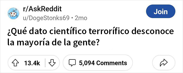 Quizás un pensamiento similar despertó la curiosidad de este Redditor. En lugar de buscar algunos datos científicos divertidos, el usuario u/DogeStonks69 preguntó a otros: "¿Qué dato científico terrorífico desconoce la mayoría de la cente?" Y vaya, los comentaristas cumplieron. Prepárate para (posiblemente) enfrentarte a algún temor existencial después de leer estas entradas.