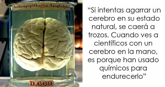 Si intentas agarrar un cerebro en su estado natural, se caerá a trozos. Cuando ves a científicos con un cerebro en la mano, es porque han usado químicos para endurecerlo.