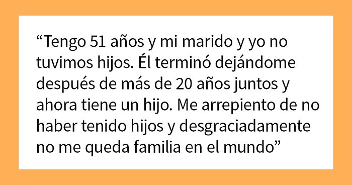 Tengo 51 años y mi marido y yo no tuvimos hijos. Él terminó dejándome después de más de 20 años juntos y ahora tiene un hijo. Me arrepiento de no haber tenido hijos y desgraciadamente no me queda familia en el mundo.