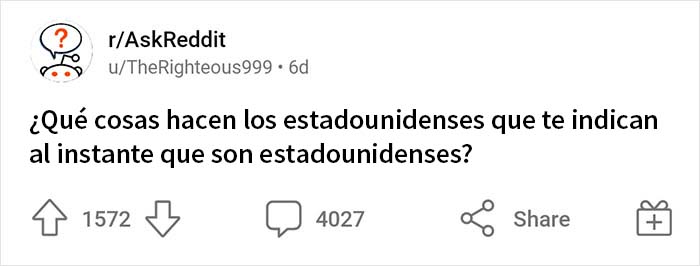 Para la gente de fuera de Estados Unidos, los estadounidenses son un grupo reconocible. Al parecer, no es sólo el acento lo que les delata. ¿Son extremadamente extrovertidos? Sí. ¿Llevan zapatos en el interior? Sí, señor. ¿Pide que le rellenen el vaso? ¡Descubierto a simple vista! Y muchos más rasgos similares, como demostró el usuario de Reddit TheRighteous999 cuando publicó esta pregunta: "¿Qué cosas hacen los estadounidenses que te indican al instante que son estadounidenses?"