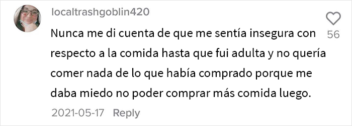 Me gusta acabarme todas las sobras. Michaela, por su parte, no se termina nada de lo que haya en el refrigerador. Esto es a causa de la inseguridad con respecto a los alimentos con la que le tocó crecer, al no saber cuándo sería la próxima vez que podría comer algo.