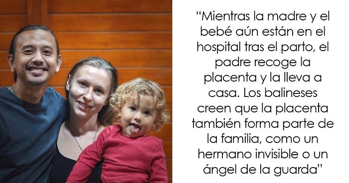 Mientras la madre y el bebé aún están en el hospital, el padre recoge la placenta del médico y la lleva a casa. Allí la lava cuidadosamente con jabón y un cepillo, reza y la entierra en el patio de la casa. Se coloca una valla para proteger el lugar y durante los tres meses siguientes se encenderá una bombilla sobre la valla y se cambiarán las ofrendas a diario. La valla se retira después, pero el lugar sigue siendo sagrado. Eso significa que también hay que poner ofrendas allí. Los balineses creen que la placenta enterrada también forma parte de la familia, como un hermano invisible o un ángel de la guarda. Y que el bebé tiene una relación mística con él.