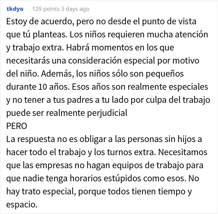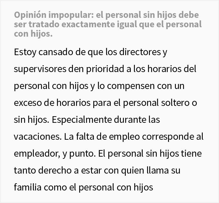Un redditor, u/Working_Falcon5384, compartió su "opinión impopular" de que todos los empleados deberían recibir el mismo trato, independientemente de los hijos que (no) tengan, en el popular subreddit r/antiwork. Su post se hizo rápidamente viral e inspiró a otros usuarios de Reddit a compartir sus experiencias sobre cómo tener hijos puede otorgar a alguien privilegios mientras que ser "sin hijos" puede en realidad ser perjudicial profesional y económicamente, dependiendo del enfoque del empleador.