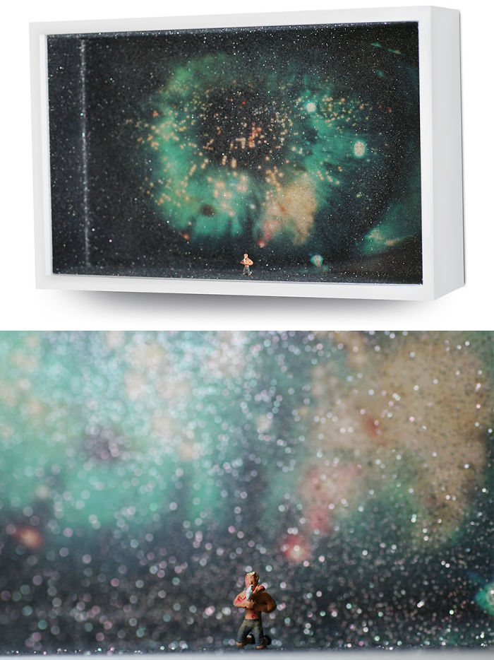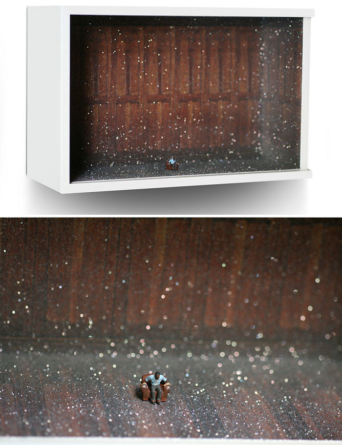 Un día de 2004, recibí como regalo una figura de un hombre en pose de victoria, pero con los brazos amputados por encima del codo. Sentí pena por él y me lo quedé. Un año o dos después de eso, lo puse en una caja de madera ordinaria. En ese momento, se transformó, como si ya no necesitara lástima. Sucedió algo mágico: se insufló vida en ese pequeño y el espacio en la caja pareció abrirse hasta el infinito. Había creado todo un universo paralelo. ¡Divino! ¡Y así nacieron las Catedrales de Cristal!