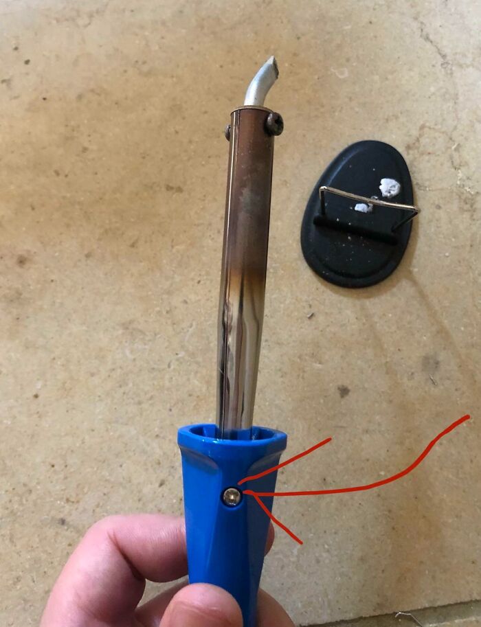 Este soldador tiene un tornillo en el mango conectado directamente a la fuente de calor. Para mí fue una sorpresa abrasadora.